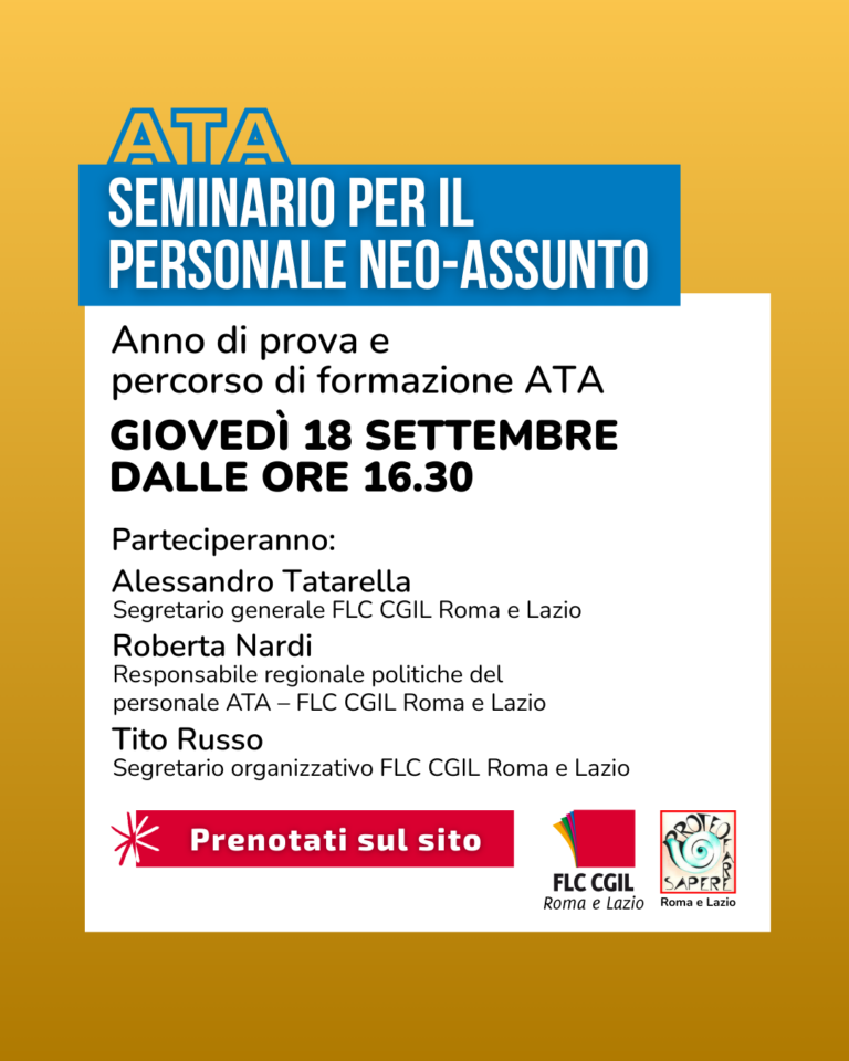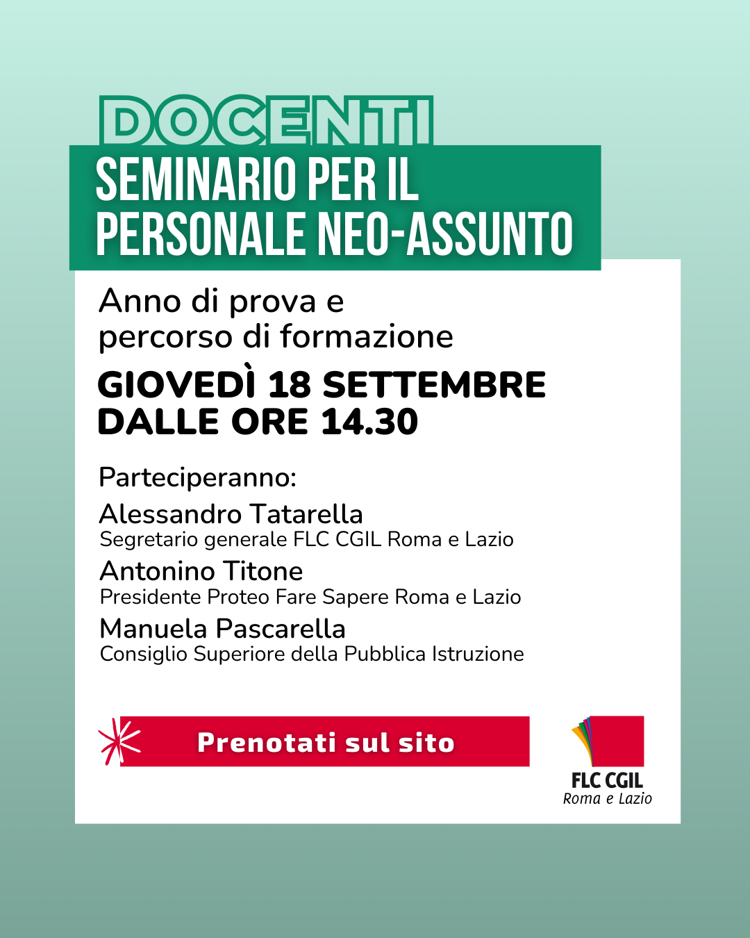18 SETTEMBRE 2025: Seminari Proteo- FLC CGIL “Anno di prova e percorso di formazione” per docenti e ATA neo-assunti nel Lazio